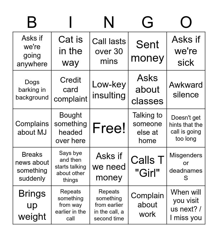 This bingo card has a free space and 24 words: Says bye and then starts talking about other things, Repeats something from way earlier in the call, Low-key insulting, Brings up weight, Asks if we're sick, Asks if we're going anywhere, Dogs barking in background, Cat is in the way, Talking to someone else at home, Asks if we need money, Asks about classes, Complains about MJ, Calls T "Girl", Misgenders or deadnames S, Credit card complaint, Complain about work, Doesn't get hints that the call is going too long, Call lasts over 30 mins, Awkward silence, Bought something headed over here, When will you visit us next? / I miss you, Breaks news about something suddenly, Sent money and Repeats something from earlier in the call, a second time.