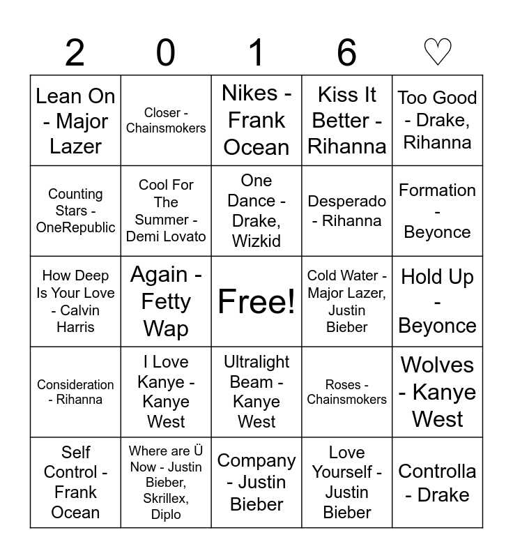 This bingo card has a free space and 30 words: Where are Ü Now - Justin Bieber, Skrillex, Diplo, What Do You Mean - Justin Bieber, Again - Fetty Wap, Never Be Like You - Flume, Lean On - Major Lazer, Nikes - Frank Ocean, Cool For The Summer - Demi Lovato, Ultralight Beam - Kanye West, Cold Water - Major Lazer, Justin Bieber, Company - Justin Bieber, Hold Up - Beyonce, Controlla - Drake, Love Yourself - Justin Bieber, Clarity - Zedd, Foxes, Formation - Beyonce, Sorry - Justin Bieber, Roses - Chainsmokers, Consideration - Rihanna, I Love Kanye - Kanye West, Too Good - Drake, Rihanna, How Deep Is Your Love - Calvin Harris, Pink + White - Frank Ocean, Closer - Chainsmokers, Desperado - Rihanna, Counting Stars - OneRepublic, Kiss It Better - Rihanna, Wolves - Kanye West, Self Control - Frank Ocean, One Dance - Drake, Wizkid and Slide - Frank Ocean, Calvin Harris, Migos.