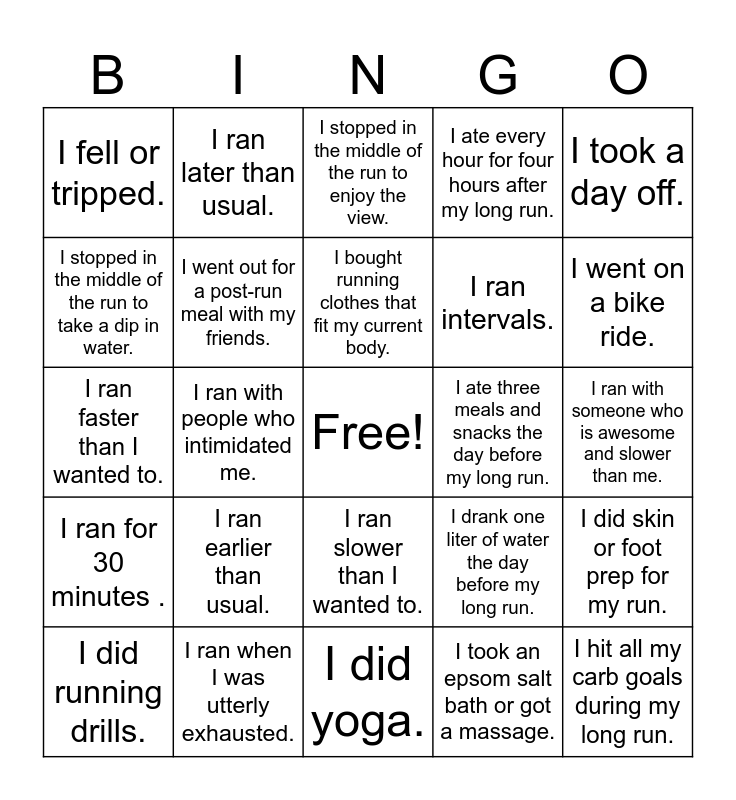 This bingo card has a free space and 24 words: I ran earlier than usual., I ran when I was utterly exhausted., I bought running clothes that fit my current body., I did running drills., I took a day off., I fell or tripped., I stopped in the middle of the run to take a dip in water., I ran later than usual., I ate three meals and snacks the day before my long run., I ran slower than I wanted to., I ran intervals., I ran faster than I wanted to., I drank one liter of water the day before my long run., I did skin or foot prep for my run., I went out for a post-run meal with my friends., I took an epsom salt bath or got a massage., I ran with someone who is awesome and slower than me., I stopped in the middle of the run to enjoy the view., I went on a bike ride., I ran with people who intimidated me., I hit all my carb goals during my long run., I ran for 30 minutes ., I ate every hour for four hours after my long run. and I did yoga..
