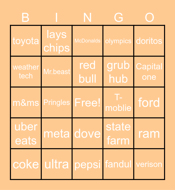This bingo card has a free space and 24 words: meta, ultra, red bull, coke, doritos, toyota, weather tech, lays chips, T-moblie, dove, grub hub, m&ms, state farm, ram, Mr.beast, fandul, ford, McDonalds, Capital one, Pringles, verison, uber eats, olympics and pepsi.