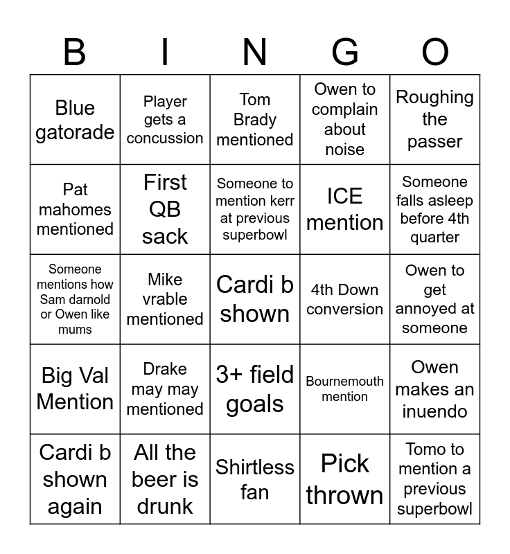 This bingo card has a free space and 24 words: Drake may may mentioned, All the beer is drunk, Someone to mention kerr at previous superbowl, Cardi b shown again, Roughing the passer, Blue gatorade, Pat mahomes mentioned, Player gets a concussion, 4th Down conversion, 3+ field goals, ICE mention, Someone mentions how Sam darnold or Owen like mums, Bournemouth mention, Owen makes an inuendo, First QB sack, Pick thrown, Owen to get annoyed at someone, Tom Brady mentioned, Someone falls asleep before 4th quarter, Mike vrable mentioned, Tomo to mention a previous superbowl, Big Val Mention, Owen to complain about noise and Shirtless fan.