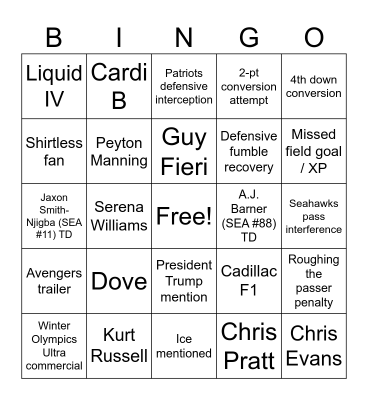 This bingo card has a free space and 62 words: TurboTax, Kurt Russell, Kenneth Walker (SEA #9) TD, Avengers trailer, Patriots pass interference, QB run for 1st down, Peyton Manning, Budweiser horse, Defensive fumble recovery, Hims & Hers, 2-pt conversion attempt, Punt return 10+ yards, Shirtless fan, Mandalorian & Grogu trailer, Seahawks defensive interception, Liquid IV, Chris Evans, 4th down conversion, Toyota, Guy Fieri, A.J. Barner (SEA #88) TD, Patriots defensive interception, Winter Olympics Ultra commercial, Chris Pratt, Apple Music Halftime Show, Kendall Jenner, Uber Eats, Hunter Henry (Pats #85) TD, Roughing the passer penalty, Coca-Cola Bear, Kayshon Boutte (Pats #9) TD, Mr. Beast, Mayonnaise, Spider-Man trailer, Seahawks pass interference, Cardi B, 4th down stop, ChatGPT, Serena Williams, Coaches challenge, Jaxon Smith-Njigba (SEA #11) TD, Ritz, Dove, RB 20+ yard run, Missed field goal / XP, Cadillac F1, Ben Stiller, Stefon Diggs (Pats #8) TD, Brian Baumgartner, Coin toss, President Trump mention, Ice mentioned, Ice ad, Crypto ad, Ad with Sydney Sweeney, Golden Gate Bridge, Taylor Swift mention, Grateful Dead mention, Joe Montana, Alcatraz, “Philly Special” and America 250th anniversary mention.