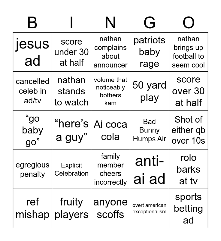 This bingo card has a free space and 24 words: Explicit Celebration, fruity players, volume that noticeably bothers kam, ref mishap, nathan brings up football to seem cool, jesus ad, cancelled celeb in ad/tv, score under 30 at half, Bad Bunny Humps Air, family member cheers incorrectly, 50 yard play, “go baby go”, anti-ai ad, rolo barks at tv, nathan stands to watch, overt american exceptionalism, Shot of either qb over 10s, nathan complains about announcer, score over 30 at half, “here’s a guy”, sports betting ad, egregious penalty, patriots baby rage and anyone scoffs.