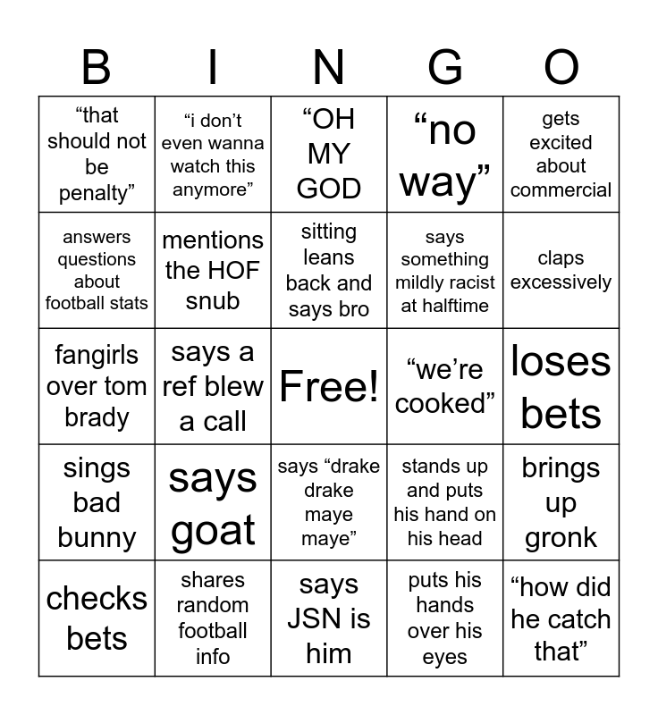 This bingo card has a free space and 24 words: says goat, shares random football info, sitting leans back and says bro, checks bets, gets excited about commercial, “that should not be penalty”, answers questions about football stats, “i don’t even wanna watch this anymore”, “we’re cooked”, says “drake drake maye maye”, says something mildly racist at halftime, fangirls over tom brady, stands up and puts his hand on his head, brings up gronk, mentions the HOF snub, puts his hands over his eyes, loses bets, “OH MY GOD, claps excessively, says a ref blew a call, “how did he catch that”, sings bad bunny, “no way” and says JSN is him.