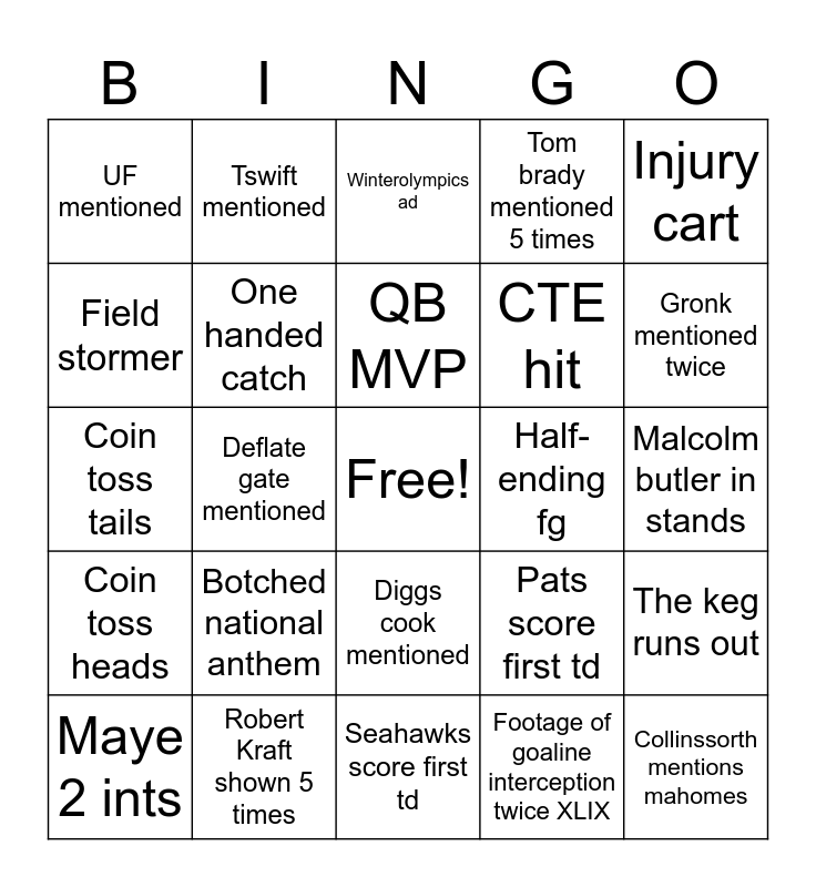This bingo card has a free space and 24 words: Botched national anthem, Robert Kraft shown 5 times, QB MVP, Maye 2 ints, Injury cart, UF mentioned, Field stormer, Tswift mentioned, Half-ending fg, Diggs cook mentioned, CTE hit, Coin toss tails, Pats score first td, The keg runs out, One handed catch, Footage of goaline interception twice XLIX, Malcolm butler in stands, Winterolympics ad, Gronk mentioned twice, Deflate gate mentioned, Collinssorth mentions mahomes, Coin toss heads, Tom brady mentioned 5 times and Seahawks score first td.