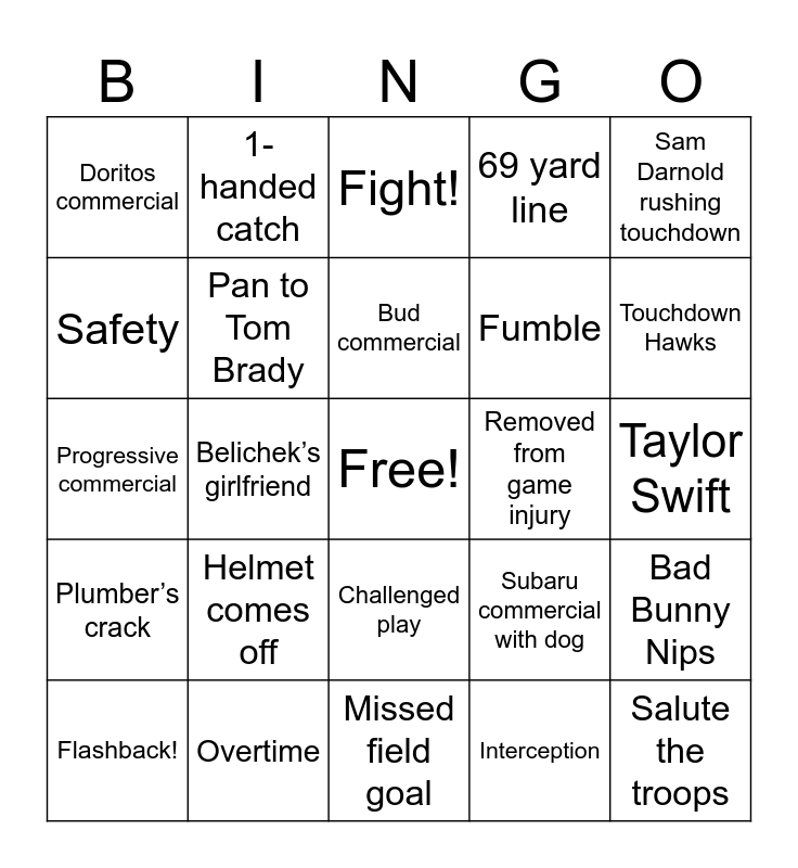 This bingo card has a free space and 28 words: Bad Bunny Nips, Patrick Mahomes, Fumble, Interception, Safety, Fight!, 1-handed catch, Plumber’s crack, Removed from game injury, Flashback!, Progressive commercial, 69 yard line, Overtime, Missed field goal, Touchdown Hawks, Touchdown Pats, Helmet comes off, Pan to Tom Brady, Bud commercial, Challenged play, Doritos commercial, Actor in crowd, Salute the troops, Belichek’s girlfriend, Taylor Swift, Subaru commercial with dog, Sam Darnold rushing touchdown and Marvel movie trailer.