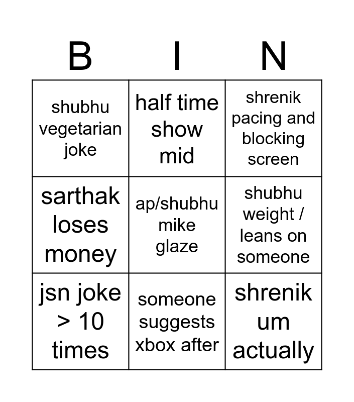 This bingo card has 9 words: jsn joke > 10 times, shrenik pacing and blocking screen, half time show mid, sarthak loses money, shubhu vegetarian joke, shubhu weight / leans on someone, ap/shubhu mike glaze, shrenik um actually and someone suggests xbox after.