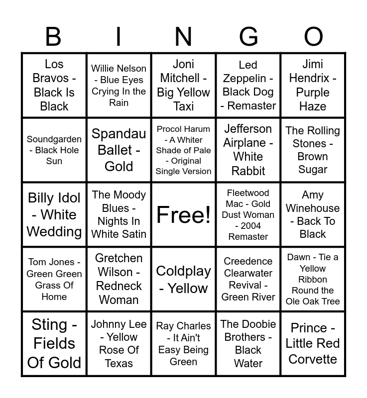 This bingo card has a free space and 75 words: Van Morrison - Brown Eyed Girl, New Order - Blue Monday, Joni Mitchell - Big Yellow Taxi, The Rolling Stones - Paint It, Black, Elton John - Goodbye Yellow Brick Road - Remastered 2014, Prince - Purple Rain, Chris de Burgh - The Lady In Red, Bruce Springsteen - Pink Cadillac - Single B-Side - 1984, Nena - 99 Red Balloons, Electric Light Orchestra - Mr. Blue Sky, The Beatles - Blackbird - Remastered 2009, The Hollies - Long Cool Woman (In a Black Dress) - 1999 Remaster, Procol Harum - A Whiter Shade of Pale - Original Single Version, Soundgarden - Black Hole Sun, Neil Diamond - Forever In Blue Jeans, The Moody Blues - Nights In White Satin, Freda Payne - Band Of Gold (Single Mix), Prince - Little Red Corvette, Madonna - True Blue, Jimi Hendrix - Purple Haze, AC/DC - Back In Black, Billy Idol - White Wedding, Spandau Ballet - Gold, Willie Nelson - Blue Eyes Crying In the Rain, Led Zeppelin - Black Dog - Remaster, Elvis Presley - Blue Suede Shoes, Michael Jackson - Black or White, Santana - Black Magic Woman, UB40 - Red Red Wine, Fats Domino - Blueberry Hill, John Mellencamp - Pink Houses, Alannah Myles - Black Velvet, Cyndi Lauper - True Colors, Creedence Clearwater Revival - Green River, The Rolling Stones - Brown Sugar, Jefferson Airplane - White Rabbit, Prince - Raspberry Beret, Toby Keith - Red Solo Cup, Amy Winehouse - Back To Black, The Doobie Brothers - Black Water, Jim Croce - Bad, Bad Leroy Brown, Paul McCartney - Ebony And Ivory - 2022 Remaster, Mitch Ryder - Devil With A Blue Dress, Elton John - I Guess That's Why They Call It The Blues, Brooks & Dunn - Red Dirt Road, Sheb Wooley - The Purple People Eater, Sting - Fields Of Gold, Los Bravos - Black Is Black, Cream - White Room, Three Dog Night - Black And White, Crystal Gayle - Don't It Make My Brown Eyes Blue, Coldplay - Yellow, Dido - White Flag, Marty Robbins - A White Sport Coat (And a Pink Carnation) (with Ray Conniff), The Platters - Red Sails In The Sunset, Eiffel 65 - Blue (Da Ba Dee) - Gabry Ponte Video Edit, David Bowie - Golden Years - 2016 Remaster, Chris Stapleton - White Horse, The Beatles - Yellow Submarine, Tommy James & The Shondells - Crimson & Clover, Gretchen Wilson - Redneck Woman, Steely Dan - Black Friday, KT Tunstall - Black Horse And The Cherry Tree - Radio Version, Deep Purple - Black Night, Neil Young - Heart of Gold, Fleetwood Mac - Gold Dust Woman - 2004 Remaster, KISS - Black Diamond - Remastered 1997, AC/DC - Black Ice, Barbra Streisand - Evergreen, Dawn - Tie a Yellow Ribbon Round the Ole Oak Tree, Tom Jones - Green Green Grass Of Home, Johnny Lee - Yellow Rose Of Texas, LeAnn Rimes - Blue, Ray Charles - It Ain't Easy Being Green and Trooper - The Boys In The Bright White Sports Car.