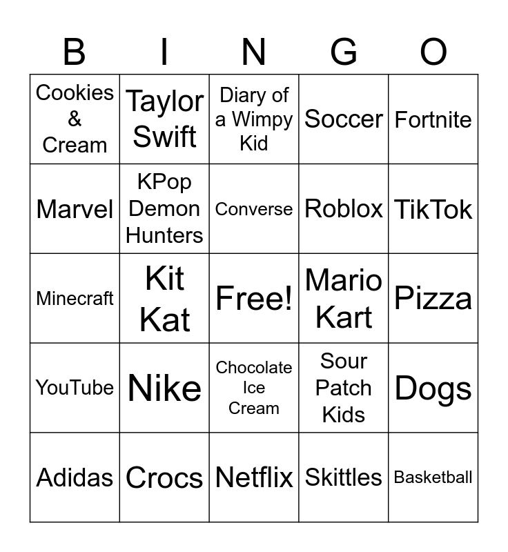This bingo card has a free space and 24 words: Nike, Crocs, Converse, Adidas, Fortnite, Cookies & Cream, Marvel, Taylor Swift, Mario Kart, Chocolate Ice Cream, Roblox, Minecraft, Sour Patch Kids, Dogs, KPop Demon Hunters, Skittles, Pizza, Diary of a Wimpy Kid, TikTok, Kit Kat, Basketball, YouTube, Soccer and Netflix.