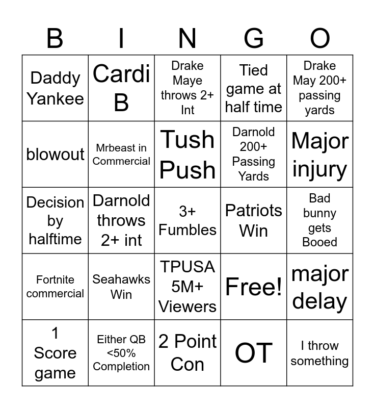 This bingo card has 25 words: Seahawks Win, 2 Point Con, Tush Push, 1 Score game, Drake May 200+ passing yards, Daddy Yankee, blowout, Cardi B, Patriots Win, TPUSA 5M+ Viewers, Darnold 200+ Passing Yards, Decision by halftime, Free!, major delay, Mrbeast in Commercial, I throw something, Bad bunny gets Booed, Drake Maye throws 2+ Int, Major injury, Darnold throws 2+ int, 3+ Fumbles, Either QB <50% Completion, Fortnite commercial, Tied game at half time and OT.