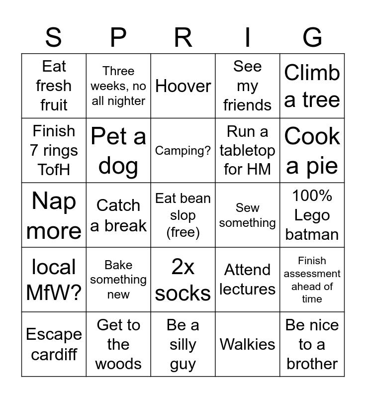 This bingo card has a free space and 24 words: Bake something new, Get to the woods, Camping?, Escape cardiff, Climb a tree, Eat fresh fruit, Finish 7 rings TofH, Three weeks, no all nighter, Sew something, 2x socks, Run a tabletop for HM, Nap more, Attend lectures, Finish assessment ahead of time, Pet a dog, Walkies, 100% Lego batman, Hoover, Cook a pie, Catch a break, Be nice to a brother, local MfW?, See my friends and Be a silly guy.