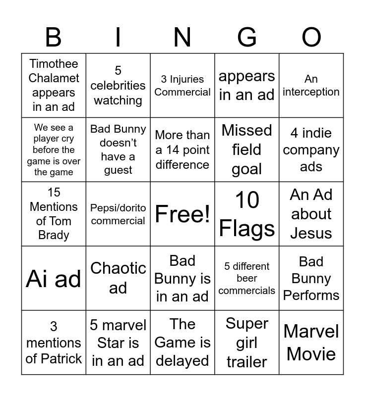 This bingo card has a free space and 26 words: Bad Bunny is in an ad, Super girl trailer, More than a 14 point difference, 5 marvel Star is in an ad, An interception, Timothee Chalamet appears in an ad, We see a player cry before the game is over the game, 5 celebrities watching, An Ad about Jesus, 5 different beer commercials, Missed field goal, 15 Mentions of Tom Brady, Bad Bunny Performs, 3 mentions of Patrick, Pepsi/dorito commercial, Zendaya, appears in an ad, Ai ad, 3 Injuries Commercial, Marvel Movie, 4 indie company ads, The Game is delayed, 10 Flags, Chaotic ad, Bad Bunny doesn’t have a guest and Someone I don't like appears in an ad.