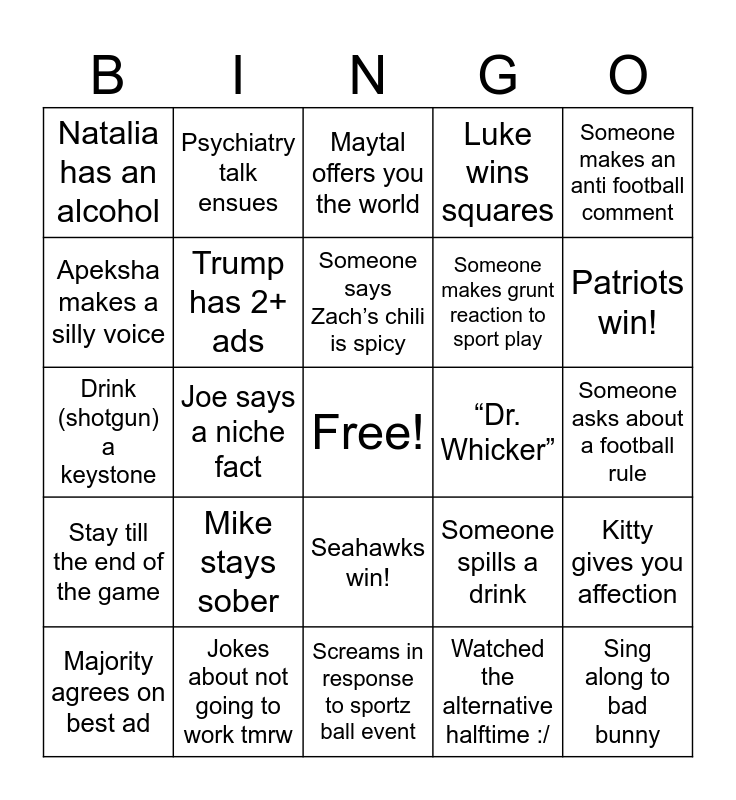 This bingo card has a free space and 24 words: Mike stays sober, Jokes about not going to work tmrw, Someone says Zach’s chili is spicy, Majority agrees on best ad, Someone makes an anti football comment, Natalia has an alcohol, Apeksha makes a silly voice, Psychiatry talk ensues, “Dr. Whicker”, Seahawks win!, Someone makes grunt reaction to sport play, Drink (shotgun) a keystone, Someone spills a drink, Kitty gives you affection, Trump has 2+ ads, Watched the alternative halftime :/, Someone asks about a football rule, Maytal offers you the world, Patriots win!, Joe says a niche fact, Sing along to bad bunny, Stay till the end of the game, Luke wins squares and Screams in response to sportz ball event.