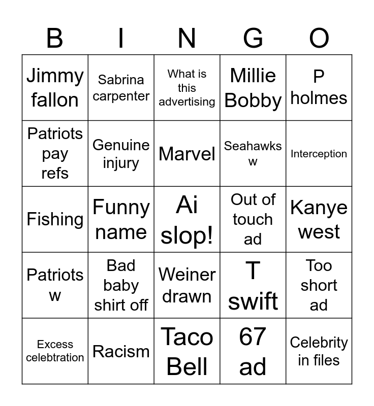 This bingo card has a free space and 24 words: Bad baby shirt off, Racism, Marvel, Excess celebtration, P holmes, Jimmy fallon, Patriots pay refs, Sabrina carpenter, Out of touch ad, Weiner drawn, Seahawks w, Fishing, T swift, Too short ad, Genuine injury, 67 ad, Kanye west, What is this advertising, Interception, Funny name, Celebrity in files, Patriots w, Millie Bobby and Taco Bell.