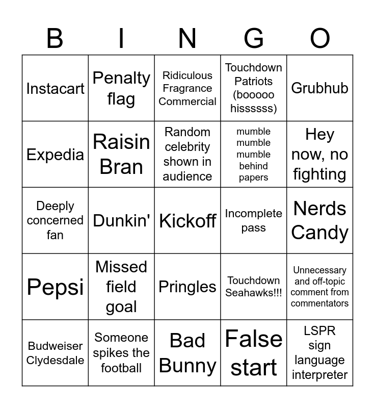 This bingo card has a free space and 29 words: Budweiser Clydesdale, Bud Light, Dunkin', e.l.f Cosmetics, Instacart, Ridiculous Fragrance Commercial, Raisin Bran, Missed field goal, Incomplete pass, Someone spikes the football, Nerds Candy, LSPR sign language interpreter, Bad Bunny, False start, Hey now, no fighting, Interception, Pringles, Pepsi, Grubhub, Deeply concerned fan, Touchdown Seahawks!!!, Field goal, mumble mumble mumble behind papers, Expedia, Touchdown Patriots (booooo hissssss), Penalty flag, Unnecessary and off-topic comment from commentators, Random celebrity shown in audience and Touchdown dance.