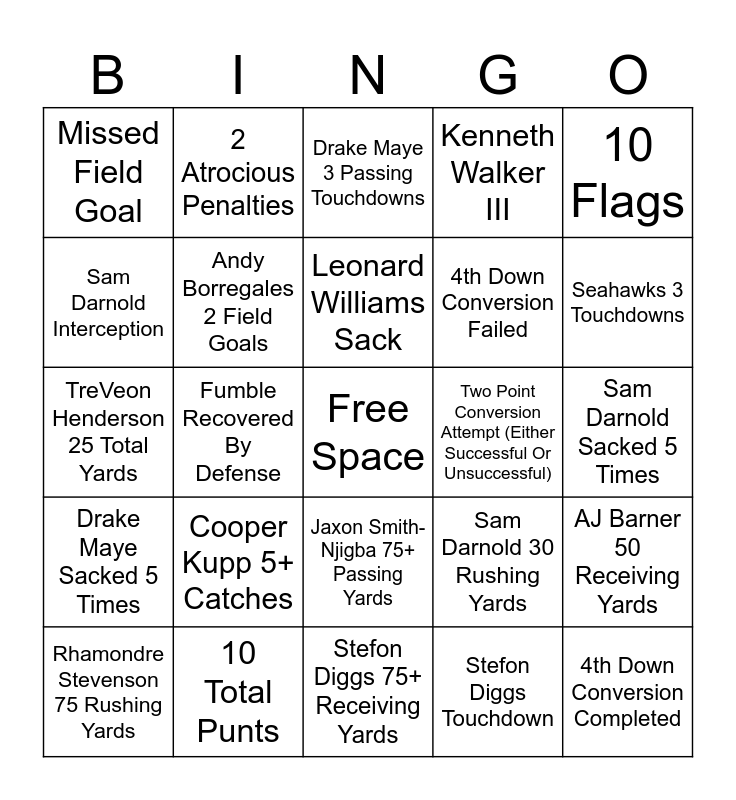 This bingo card has a free space and 24 words: Cooper Kupp 5+ Catches, 10 Total Punts, Leonard Williams Sack, Rhamondre Stevenson 75 Rushing Yards, 10 Flags, Missed Field Goal, Sam Darnold Interception, 2 Atrocious Penalties, Two Point Conversion Attempt (Either Successful Or Unsuccessful), Jaxon Smith-Njigba 75+ Passing Yards, 4th Down Conversion Failed, TreVeon Henderson 25 Total Yards, Sam Darnold 30 Rushing Yards, AJ Barner 50 Receiving Yards, Andy Borregales 2 Field Goals, Stefon Diggs Touchdown, Sam Darnold Sacked 5 Times, Drake Maye 3 Passing Touchdowns, Seahawks 3 Touchdowns, Fumble Recovered By Defense, 4th Down Conversion Completed, Drake Maye Sacked 5 Times, Kenneth Walker III and Stefon Diggs 75+ Receiving Yards.