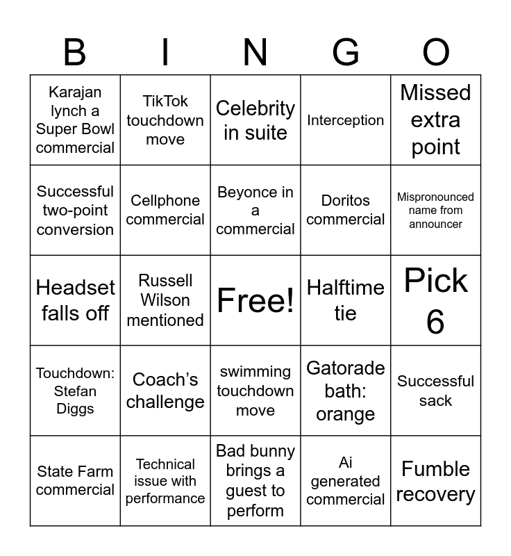 This bingo card has a free space and 26 words: swimming touchdown move, Ai generated commercial, Beyonce in a commercial, Technical issue with performance, Missed extra point, Karajan lynch a Super Bowl commercial, Successful two-point conversion, TikTok touchdown move, Pick 6, Gatorade bath: orange, Doritos commercial, Headset falls off, Successful sack, State Farm commercial, Russell Wilson mentioned, “Now here’s a guy…”, Interception, Touchdown: Stefan Diggs, Celebrity in suite, Fumble recovery, Mispronounced name from announcer, Bad bunny brings a guest to perform, Halftime tie, Coach’s challenge, Cellphone commercial and Musician album announcement.