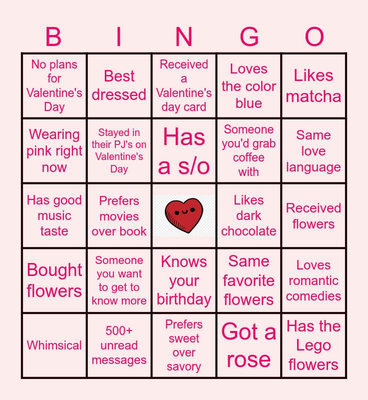 This bingo card has a free space and 26 words: Knows your birthday, Got a rose, Has a s/o, 500+ unread messages, Likes matcha, No plans for Valentine's Day, Wearing pink right now, Best dressed, Received flowers, Same favorite flowers, Someone you'd grab coffee with, Has good music taste, Loves romantic comedies, Whimsical, Prefers movies over book, Someone born in February, Loves the color blue, Bought flowers, Received a Valentine's day card, Has the Lego flowers, Same love language, Prefers sweet over savory, Likes dark chocolate, Someone you want to get to know more, Stayed in their PJ's on Valentine's Day and Cooked food for their Valentine.