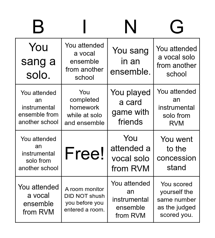 This bingo card has 18 words: Free!, You scored yourself the same number as the judged scored you., You sang in an ensemble., You sang a solo., You attended a vocal solo from RVM, You attended a vocal solo from another school, You attended a vocal ensemble from RVM, You attended a vocal ensemble from another school, You attended an instrumental solo from RVM, You attended an instrumental solo from another school, You attended an instrumental ensemble from RVM, You attended an instrumental ensemble from another school, You went to the concession stand, You completed homework while at solo and ensemble, You played a card game with friends, You walked quietly in the hallways., A room monitor DID NOT shush you before you entered a room. and You helped someone find their site..