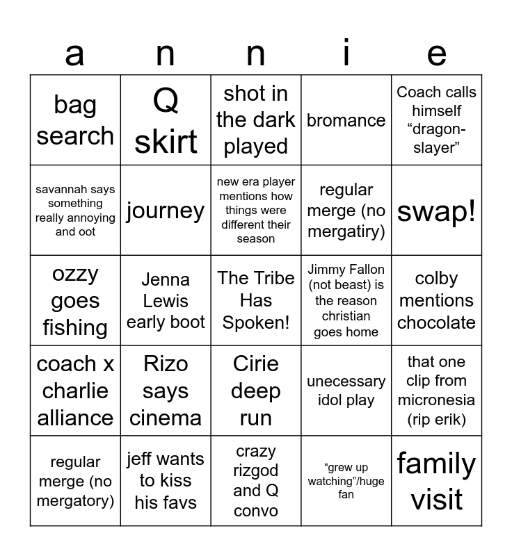 This bingo card has a free space and 122 words: big strong man alliance, friendship always wins loyalty alliance, old school alliance, Ozzy goes fishing, Vatu chaos/cursed tribe, Colby x Rizo, Q skirt, Stephanie says "wuder", crazy rizgod and Q convo, old ppl not understanding a pop culture ref, buff worn in an interesting way, emily flippin x christian hubicki, white lotus mention, ozzy wins 0 individual immunity, ozzy most times voted out record break, med-evac, regular merge (no mergatory), water well strategy, meditation, double elimination, “grew up watching”/huge fan, new era player mentions how things were different their season, old era player mentions how survivor has changed, “damage control”, jenna lewis first confessional, bromance, jeff wants to kiss his favs, LIVE TRIBAL, Survivor50Challenge mention, montage, liscensed music, ozzy goes fishing, coach x charlie alliance, charlie says some stupid taylor swift shi, LawyersRus, rick devens weatherman voice, q v aubrey, no final 4 fire, angelina joke (jacketgate/ rice), jeff monologue, RD early boot :(, dee early boot, Kyle early boot, chrissy voted out at 4, applebees reward, idol found, obvious lie (person lied to knows), RD ties/breaks career idol record, medivac, Jenna Lewis early boot, Jenan Lewis vs winners, regular merge (no mergatiry), someone not intrested in coach schtick, "want to play with strong players", “grew up watching”/ "huge fan", ozzy being entitled, johnathan learns strategy! (evil johnathan), bromamce, RETURN OF THE CAR CURSE, swap!, family visit, huge challenge comeback, necessary ii win, christian does a slide puzzle, Brob/Sandra/Parvati/Tony mention, journey, "keep the tribe strong", colby mentions chocolate, return of sassy jeff, unecessary idol play, Jimmy Fallon (not beast) is the reason christian goes home, shot in the dark played, weird jury outfit, stupid metaphor, iconic Aubrey confessional, kamilla throws someone under the bus, bag search, the last gasp, simmotion final 4, player claims to be swing vote, funny joke thru editing, that one clip from micronesia (rip erik), savannah says something really annoying and oot, someone says "RIZGOD" (not him), goes to rocks, mansplaining, fear of women's alliance, tribe looses 3 challenges in a row, rock paper scissors decision, tree mail is read, "playing under the radar", drama over who's taken for reward, slo-mo, Q gets on Tiff's nerves, operation italy mention, genevieve mushaluk deep run (PLEAK), BwB 2.0, they know how 49ers places, 2+ players mention they JUST saw kyle win, Cirie deep run, colby visible frustrated after loosing (probs reed's fault), coach chi, feastables, billie eilish boomerang idol, tiff in final 5, Coach calls himself “dragon-slayer”, Someone calls Coach "Benjiman", Another player calls Coach “dragon slayer”, Cirie sits out a challenge, Johnathan impressive feat of strength, Kyle or Kamilla mentions being a duo, someone in the room mentions they love christian hubicki (cannot be prompted or you), Dee big toe mention, “The man the myth the legend R-I-Z-G-O-D”, Rizo says cinema, Stephanie gets annoyed at someone, “The last time I was on the island”, coach hates dee, Idol played for another player, Bad Swap, Emily clocks someone's tea at the marooning. and start on a boat.
