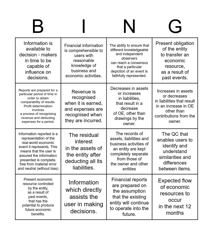 This bingo card has 16 words: Information which directly assists the user in making decisions., The QC that enables users to identify and understand similarities and differences between items., The ability to ensure that different knowledgeable and independent observers can reach a consensus that a particular depiction of an event is faithfully represented., Information is available to decision - makers in time to be capable of influence on decisions., Information reported is a representation of the real-world economic event it represents. This means that the user is assured the information presented is complete, free from material error and neutral (without bias), Financial information is comprehensible to users with reasonable knowledge of business and economic activities., The records of assets, liabilities and business activities of an entity are kept completely separate from those of the owner and other entities, Financial reports are prepared on the assumption that the existing entity will continue to operate into the future., Reports are prepared for a particular period of time in order to obtain comparability of results. Profit determination involves a process of recognising revenue and deducting expenses for a period., Revenue is recognised when it is earned, and expenses are recognised when they are incurred., Present economic resource controlled by the entity, as a result of past events, that has the potential to produce future economic benefits., Present obligation of the entity to transfer an economic resource, as a result of past events., The residual interest in the assets of the entity after deducting all its liabilities., Increases in assets or decreases in liabilities that result in an increase in OE other than contributions from the owner., Decreases in assets or increases in liabilities, that result in a decrease of OE, other than drawings by the owner. and Expected flow of economic resources to occur in the next 12 months.