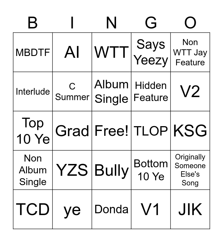 This bingo card has a free space and 29 words: TCD, LR, Grad, 808s, MBDTF, WTT, C Summer, YZS, TLOP, ye, KSG, JIK, Donda, V1, V2, Donda 2, Bully, Non Album Single, Non WTT Jay Feature, Top 10 Ye, Bottom 10 Ye, Pt 2, Hidden Feature, Interlude, Says Yeezy, AI, Originally Someone Else's Song, Album Single and Deluxe Track.