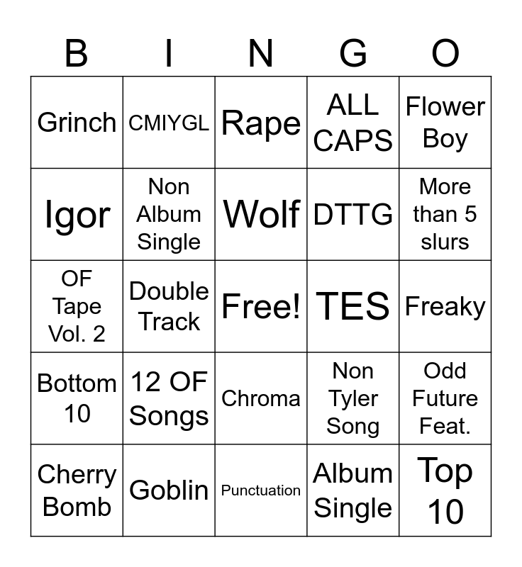 This bingo card has a free space and 24 words: 12 OF Songs, Goblin, Wolf, Cherry Bomb, Flower Boy, Grinch, Igor, CMIYGL, TES, Chroma, DTTG, OF Tape Vol. 2, Non Tyler Song, Odd Future Feat., Non Album Single, Album Single, Freaky, Rape, More than 5 slurs, Double Track, Top 10, Bottom 10, ALL CAPS and Punctuation.
