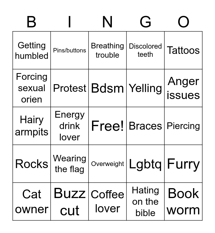This bingo card has a free space and 24 words: Wearing the flag, Buzz cut, Bdsm, Cat owner, Tattoos, Getting humbled, Forcing sexual orien, Pins/buttons, Braces, Overweight, Yelling, Hairy armpits, Lgbtq, Furry, Protest, Hating on the bible, Piercing, Breathing trouble, Anger issues, Energy drink lover, Book worm, Rocks, Discolored teeth and Coffee lover.