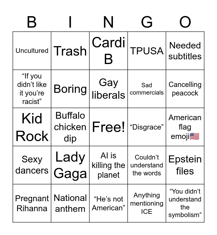 This bingo card has a free space and 24 words: Lady Gaga, National anthem, Gay liberals, Pregnant Rihanna, Needed subtitles, Uncultured, “If you didn’t like it you’re racist”, Trash, “Disgrace”, AI is killing the planet, Sad commercials, Kid Rock, Couldn’t understand the words, Epstein files, Boring, Anything mentioning ICE, American flag emoji🇺🇸, Cardi B, Cancelling peacock, Buffalo chicken dip, “You didn’t understand the symbolism”, Sexy dancers, TPUSA and “He’s not American”.