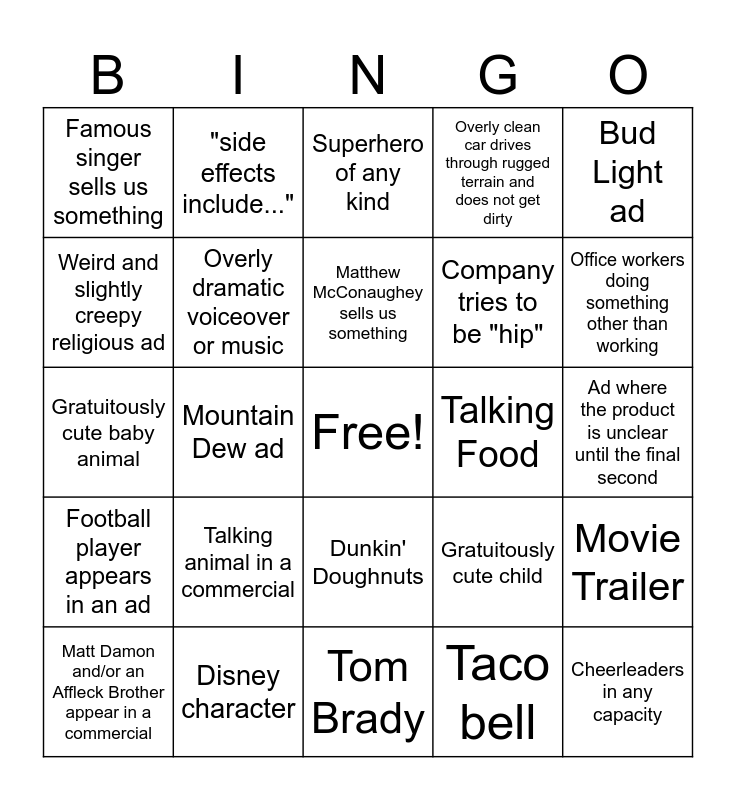 This bingo card has a free space and 24 words: Talking animal in a commercial, Disney character, Matthew McConaughey sells us something, Matt Damon and/or an Affleck Brother appear in a commercial, Bud Light ad, Famous singer sells us something, Weird and slightly creepy religious ad, "side effects include...", Talking Food, Dunkin' Doughnuts, Company tries to be "hip", Gratuitously cute baby animal, Gratuitously cute child, Movie Trailer, Overly dramatic voiceover or music, Taco bell, Ad where the product is unclear until the final second, Superhero of any kind, Office workers doing something other than working, Mountain Dew ad, Cheerleaders in any capacity, Football player appears in an ad, Overly clean car drives through rugged terrain and does not get dirty and Tom Brady.
