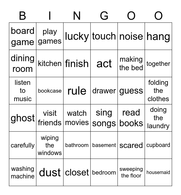 This bingo card has 36 words: basement, bathroom, bedroom, dining room, ghost, drawer, kitchen, closet, noise, scared, together, touch, cupboard, bookcase, act, board game, carefully, guess, listen to music, lucky, rule, visit friends, sing songs, watch movies, read books, play games, making the bed, dust, finish, hang, housemaid, washing machine, doing the laundry, folding the clothes, wiping the windows and sweeping the floor.