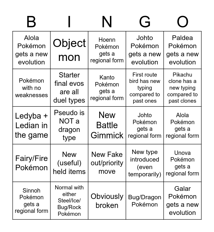 This bingo card has a free space and 58 words: Ice/Poison Pokémon, Normal with either Steel/Ice/ Bug/Rock Pokémon, Fairy/Ground Pokémon, Fairy/Fire Pokémon, Bug/Dragon Pokémon, Rock/Ghost Pokémon, Starter final evos are all duel types, First route bug has new typing compared to past ones, First route bird has new typing compared to past ones, Kanto Pokémon gets a new evolution, Johto Pokémon gets a new evolution, Hoenn Pokémon gets a new evolution, Sinnoh Pokémon gets a new evolution, Unova Pokémon gets a new evolution, Kalos Pokémon gets a new evolution, Alola Pokémon gets a new evolution, Galar Pokémon gets a new evolution, Paldea Pokémon gets a new evolution, Gimmick changes forms of Pokémon, Kanto Pokémon gets a regional form, Johto Pokémon gets a regional form, Hoenn Pokémon gets a regional form, Sinnoh Pokémon gets a regional form, Unova Pokémon gets a regional form, Kalos Pokémon gets a regional form, Alola Pokémon gets a regional form, Galar Pokémon gets a regional form, Paldea Pokémon gets a regional form, Pikachu clone has a new typing compared to past clones, First route bug is a regional form, New regional form of Pikachu, Elite 4 has a Normal or Grass member, New ability introduced, 100+ new Pokémon, Ability introduced has the same effect as a past one, New ability's effect has the same as a held item, One box legendary has a type advantage over the other, Pseudo is NOT a dragon type, Ledyba + Ledian in the game, Non-water type fish, New (useful) held items, New baby Pokémon, New type introduced (even temporarily), New convergent Pokémon species, Another new Flying/Normal, Intimidate but for special attack, "Why isn't it ____ typing?", New Fake out/priority move, Obviously broken, Obviously trash, New Eevee-lution, New Poke ball, Legendary Trio (Includes box legendaries), A starter is the same species as a previous starter, Object mon, Fake leaks for starter evos, Pokémon with no weaknesses and New Australian based Pokémon.