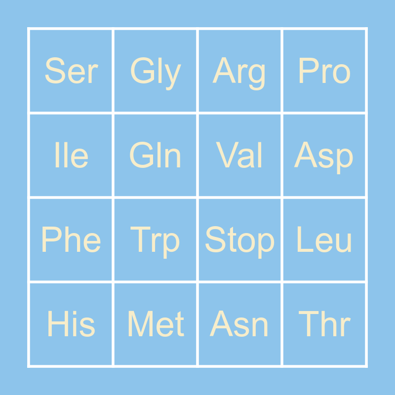 This bingo card has 16 words: Met, Leu, Arg, Ser, Phe, Gly, Stop, Asn, Ile, Gln, His, Pro, Trp, Asp, Val and Thr.