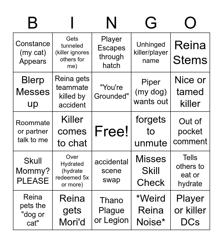 This bingo card has a free space and 24 words: Over Hydrated (hydrate redeemed 5x or more), Reina gets Mori'd, "You're Grounded", Reina pets the "dog or cat", Reina Stems, Constance (my cat) Appears, Blerp Messes up, Gets tunneled (killer ignores others for me), forgets to unmute, accidental scene swap, Piper (my dog) wants out, Roommate or partner talk to me, Misses Skill Check, Tells others to eat or hydrate, Reina gets teammate killed by accident, *Weird Reina Noise*, Out of pocket comment, Player Escapes through hatch, Nice or tamed killer, Killer comes to chat, Player or killer DCs, Skull Mommy? PLEASE, Unhinged killer/player name and Thano Plague or Legion.