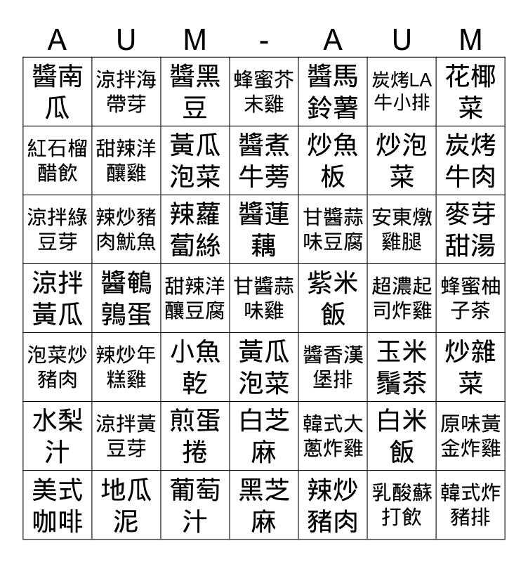 This bingo card has 49 words: 白米飯, 炒泡菜, 辣炒豬肉, 醬鵪鶉蛋, 辣蘿蔔絲, 蜂蜜柚子茶, 涼拌海帶芽, 葡萄汁, 炭烤LA牛小排, 黃瓜泡菜, 花椰菜, 蜂蜜芥末雞, 安東燉雞腿, 甘醬蒜味豆腐, 涼拌黃豆芽, 超濃起司炸雞, 紅石榴醋飲, 炭烤牛肉, 原味黃金炸雞, 醬馬鈴薯, 炒魚板, 甜辣洋釀豆腐, 醬南瓜, 甜辣洋釀雞, 美式咖啡, 黃瓜泡菜, 麥芽甜湯, 地瓜泥, 醬蓮藕, 辣炒豬肉魷魚, 韓式炸豬排, 紫米飯, 水梨汁, 煎蛋捲, 涼拌黃瓜, 醬香漢堡排, 玉米鬚茶, 炒雜菜, 涼拌綠豆芽, 小魚乾, 白芝麻, 泡菜炒豬肉, 甘醬蒜味雞, 黑芝麻, 醬煮牛蒡, 醬黑豆, 韓式大蔥炸雞, 辣炒年糕雞 and 乳酸蘇打飲.