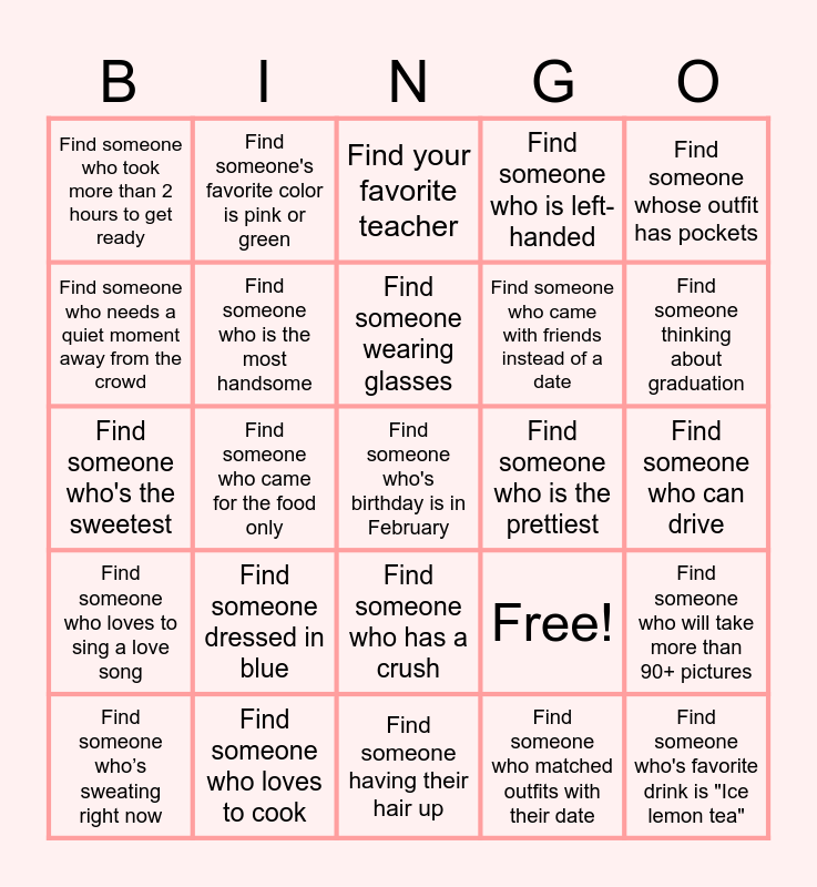 This bingo card has 25 words: Find someone dressed in blue, Find someone having their hair up, Find someone wearing glasses, Find someone who’s sweating right now, Find someone whose outfit has pockets, Find someone who took more than 2 hours to get ready, Find someone who needs a quiet moment away from the crowd, Find someone's favorite color is pink or green, Find someone who is the prettiest, Find someone who has a crush, Find someone who came with friends instead of a date, Find someone who's the sweetest, Free!, Find someone who will take more than 90+ pictures, Find someone who is the most handsome, Find someone who's favorite drink is "Ice lemon tea", Find someone who can drive, Find your favorite teacher, Find someone thinking about graduation, Find someone who came for the food only, Find someone who's birthday is in February, Find someone who loves to cook, Find someone who loves to sing a love song, Find someone who is left-handed and Find someone who matched outfits with their date.