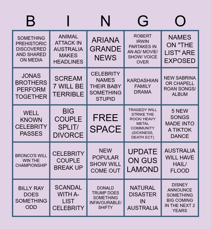 This bingo card has a free space and 24 words: CELEBRITY COUPLE BREAK UP, SCANDAL WITH A-LIST CELEBRITY, CELEBRITY NAMES THEIR BABY SOMETHING STUPID, BILLY RAY DOES SOMETHING ODD, NAMES ON "THE LIST" ARE EXPOSED, SOMETHING PREHISTORIC DISCOVERED AND SHARED ON MEDIA, JONAS BROTHERS PERFORM TOGETHER, ANIMAL ATTACK IN AUSTRALIA MAKES HEADLINES, TRAGEDY WILL STRIKE THE ROCK/ HEAVY METAL COMMUNITY (SICKNESS, DEATH ECT), NEW POPULAR SHOW WILL COME OUT, KARDASHIAN FAMILY DRAMA, WELL KNOWN CELEBRITY PASSES, UPDATE ON GUS LAMOND, AUSTRALIA WILL HAVE HAIL/ FLOOD, SCREAM 7 WILL BE TERRIBLE, NATURAL DISASTER IN AUSTRALIA, 5 NEW SONGS MADE INTO A TIKTOK DANCE, ARIANA GRANDE NEWS, NEW SABRINA OR CHAPELL ROAN SONGS/ ALBUM, BIG COUPLE SPLIT/ DIVORCE, DISNEY ANNOUNCE SOMETHING BIG COMING IN THE NEXT 2 YEARS, BRONCO'S WILL WIN THE CHAMPIONSHIP, ROBERT IRWIN PARTAKES IN AN AD/ MOVIE/ SHOW/ VOICE OVER and DONALD TRUMP DOES SOMETHING INFAVOURABLE/ SHIFTY.