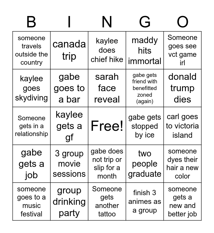 This bingo card has a free space and 24 words: 3 group movie sessions, group drinking party, sarah face reveal, someone goes to a music festival, Someone goes see vct game irl, someone travels outside the country, kaylee goes skydiving, canada trip, gabe gets stopped by ice, gabe does not trip or slip for a month, gabe gets friend with benefitted zoned (again), Someone gets in a relationship, two people graduate, someone dyes their hair a new color, gabe goes to a bar, finish 3 animes as a group, carl goes to victoria island, kaylee does chief hike, donald trump dies, kaylee gets a gf, someone gets a new and better job, gabe gets a job, maddy hits immortal and Someone gets another tattoo.