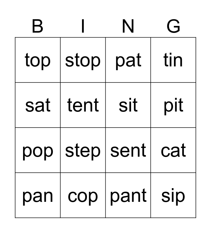 This bingo card has 20 words: cat, cap, pat, tap, pan, sat, cop, top, pop, stop, step, sent, tent, sip, sit, pin, pit, tin, pant and camp.