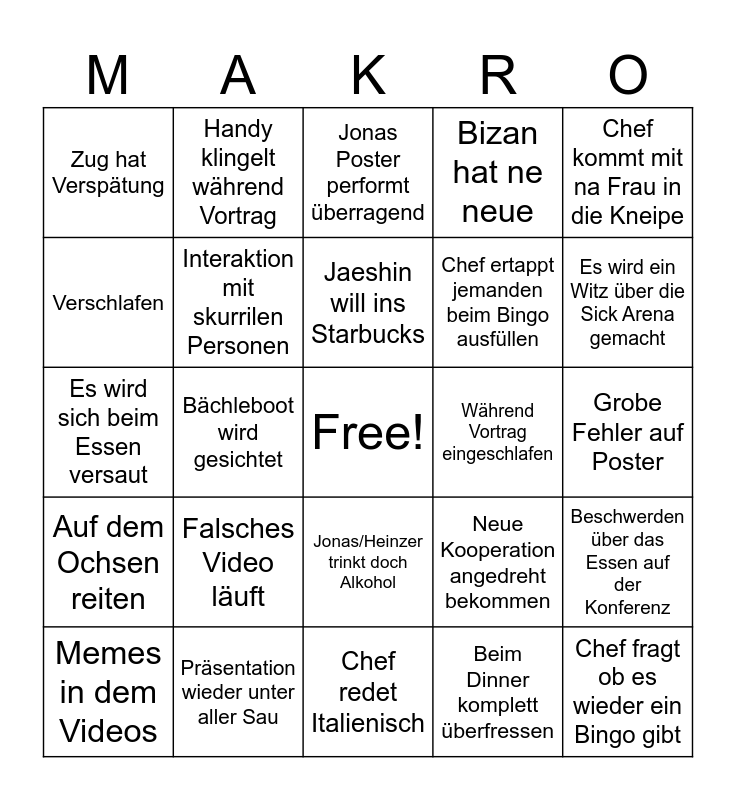 This bingo card has a free space and 54 words: An Straßenumfrage teilnehmen, Auf dem Ochsen reiten, Frage wo die Freiburg ist, Ins Bächle treten, Jonas/Heinzer trinkt doch Alkohol, Bizan hat die Alte wieder dabei, Bizan hat ne neue, Wilde Kombination beim Frühstück, Verschlafen, Zug fällt aus, Zug hat Verspätung, Etwas wichtiges daheim vergessen, Präsentation wieder unter aller Sau, Memes in dem Videos, Chef lobt Primo Markt, Chef redet Italienisch, Chef fragt ob es wieder ein Bingo gibt, Chef ertappt jemanden beim Bingo ausfüllen, Grobe Fehler auf Präsentation, Grobe Fehler auf Poster, Neue Kooperation angedreht bekommen, Comic Sans in der Präsi, Während Vortrag eingeschlafen, Chef kommt mit na Frau in die Kneipe, Es wird ohne Ticket Bahn gefahren, Handy klingelt während Vortrag, Ausraster bei den Vorträgen, Jogginghose auf Konferenz oder Dinner, Ugly Foto auf der Casting Couch, Beim Dinner komplett überfressen, Beschwerden über den Kaffee auf der Konferenz, Wein ist alle, Jemand wird zum Kennzeichensammler konvertiert, "That´s a very good Question", Jonas Poster performt überragend, Jonas Poster performt eher weniger gut, Es wird sich beim Essen versaut, Beschwerden über das Essen auf der Konferenz, Es wird ein Doppelgänger gesehen, Interaktion mit skurrilen Personen, Im Zug wird sich daneben benommen, Babedi Bubedi im Primo, Trulla schreit rum, Bass boosted Video, Falsches Video läuft, Huddel bei de Videos, "wo is mei Hos?", Jemand labert mit den Ausstellern nur um Werbegeschenke zu bekommen, Jaeshin will ins Starbucks, Bächleboot wird gesichtet, Es wird ein Witz über die Sick Arena gemacht, Während den Vorträgen irgendwo eingepennt, Friederike Adams taucht wieder bei Chef auf and KI slop.