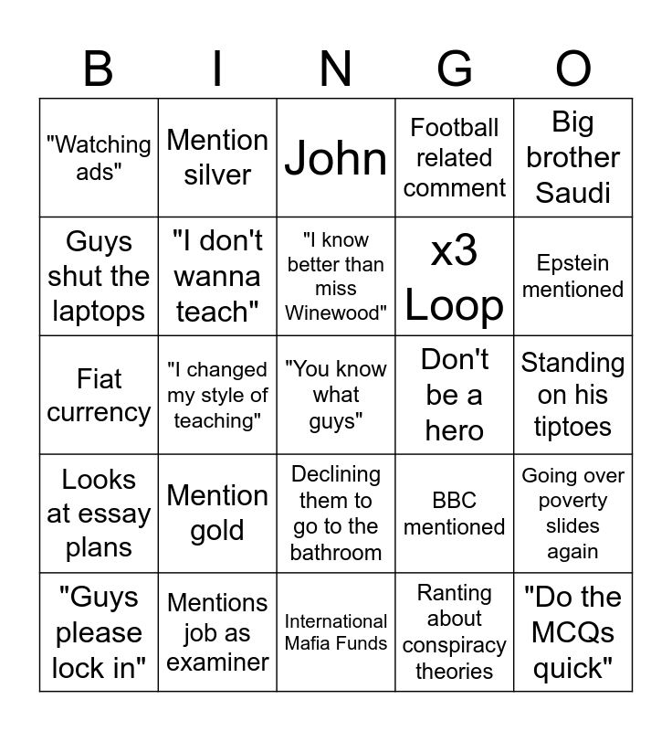 This bingo card has a free space and 24 words: Mention gold, Mentions job as examiner, "I know better than miss Winewood", "Guys please lock in", Big brother Saudi, "Watching ads", Guys shut the laptops, Mention silver, Don't be a hero, Declining them to go to the bathroom, x3 Loop, Fiat currency, BBC mentioned, Going over poverty slides again, "I don't wanna teach", Ranting about conspiracy theories, Standing on his tiptoes, John, Epstein mentioned, "I changed my style of teaching", "Do the MCQs quick", Looks at essay plans, Football related comment and International Mafia Funds.