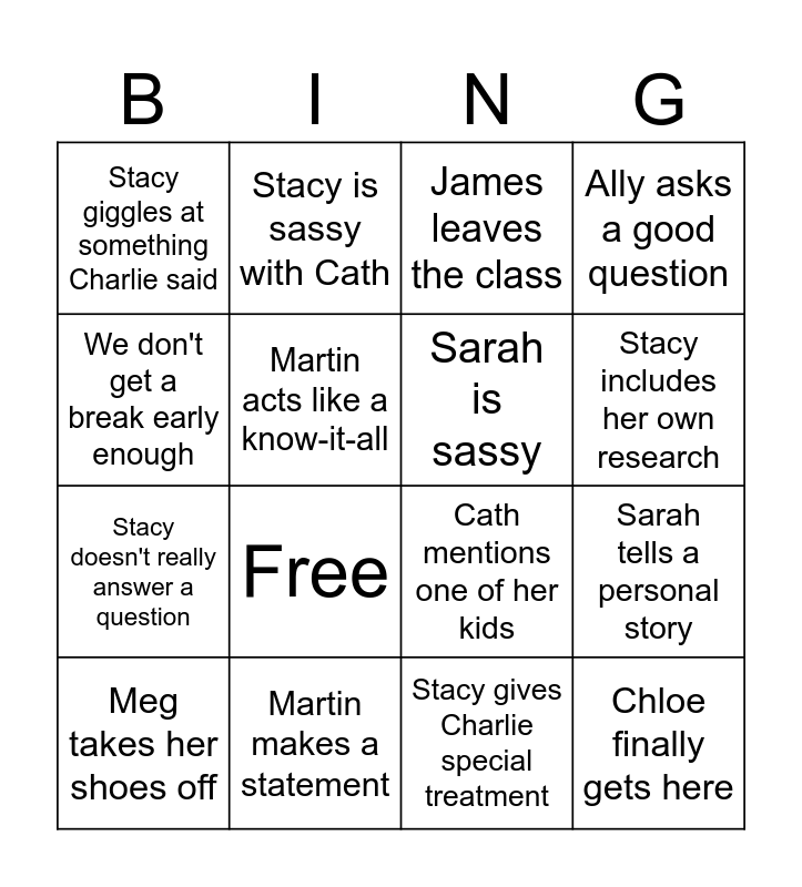 This bingo card has 16 words: Martin makes a statement, Sarah tells a personal story, James leaves the class, Stacy giggles at something Charlie said, Stacy doesn't really answer a question, Stacy is sassy with Cath, Cath mentions one of her kids, Stacy gives Charlie special treatment, We don't get a break early enough, Martin acts like a know-it-all, Meg takes her shoes off, Ally asks a good question, Free, Stacy includes her own research, Sarah is sassy and Chloe finally gets here.