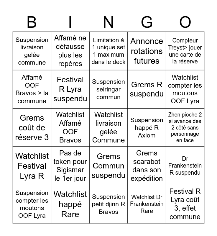 This bingo card has 25 words: Pas de token pour Sigismar le 1er jour, Suspension petit djinn R Bravos, Suspension seiringar commun, Suspension compter les moutons OOF Lyra, Compteur Treyst> jouer une carte de la réserve, Suspension livraison gelée commune, Affamé OOF Bravos > la commune, Affamé ne défausse plus les repères, Suspension happé R Axiom, Grems Commun suspendu, Grems R suspendu, Grems coût de réserve 3, Grems scarabot dans son expédition, Dr Frankenstein R suspendu, Festival R Lyra suspendu, Festival R Lyra coût 3, effet commune, Zhen pioche 2 si avance des 2 côté sans personnage en face, Limitation à 1 unique set 1 maximum dans le deck, Watchlist compter les moutons OOF Lyra, Watchlist Affamé OOF Bravos, Watchlist livraison gelée Commune, Watchlist happé Rare, Watchlist Festival Lyra R, Annonce rotations futures and Watchlist Dr Frankenstein Rare.