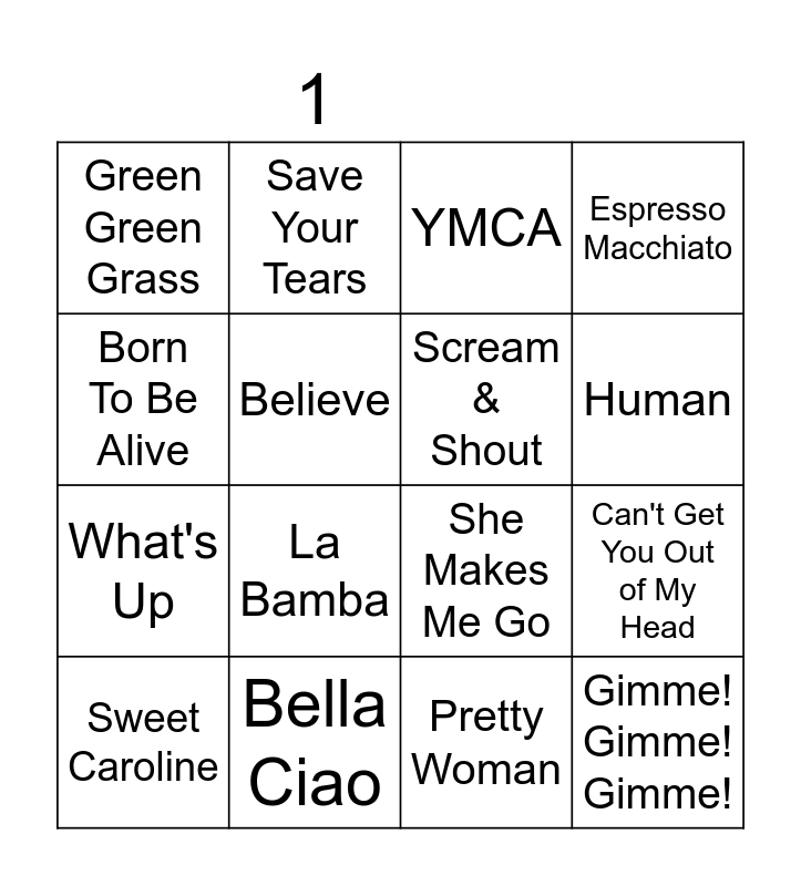 This bingo card has 25 words: Xemx u Xita, Survive, Human, ALICE, Born To Be Alive, Green Green Grass, Believe, Save Your Tears, Bella Ciao, Un Emozione Per Sempre, What's Up, She Makes Me Go, It's My Life, Summer of 69, Scream & Shout, Wake Me Up, Pretty Woman, YMCA, La Bamba, Can't Get You Out of My Head, Sweet Caroline, Let Me Stay, Gimme! Gimme! Gimme!, Espresso Macchiato and I Don't Care.