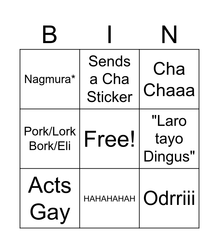 This bingo card has a free space and 10 words: HAHAHAHAH, Cha Chaaa, Nagmura*, Odrriii, Pork/Lork Bork/Eli, Acts Gay, Sends a Cha Sticker, Sends a Genshin/HSR, "Laro tayo Dingus" and Asan na si ___?.