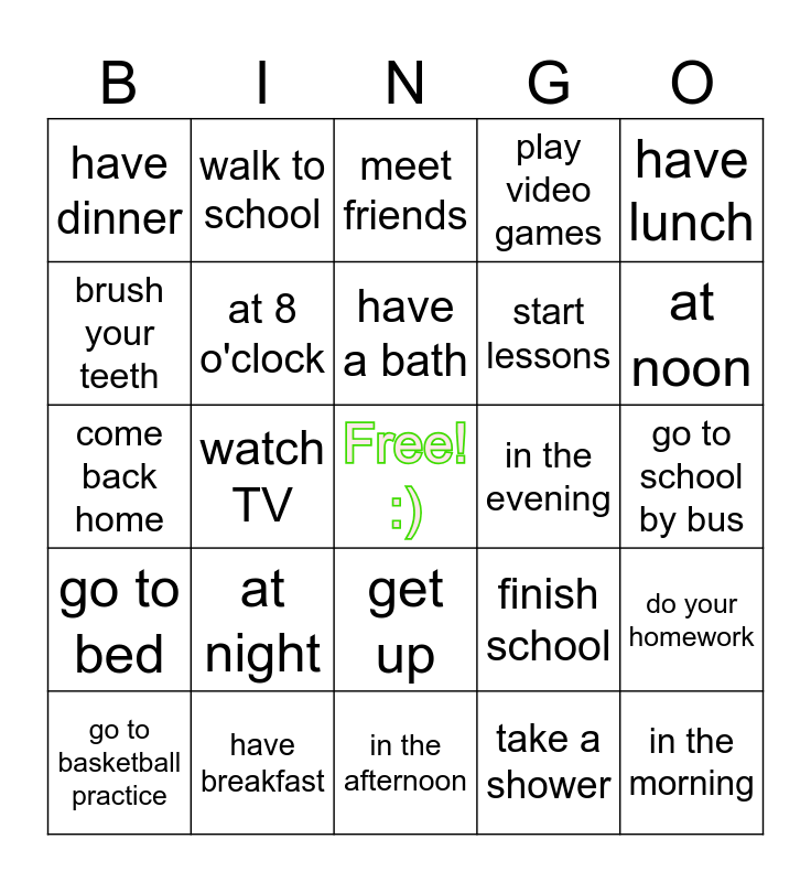 This bingo card has a free space and 26 words: get up, take a shower, have a bath, have breakfast, have lunch, have dinner, brush your teeth, walk to school, go to school by bus, finish school, start lessons, come back home, do your homework, go to basketball practice, watch TV, watch videos online, play video games, go to bed, meet friends, in the morning, at noon, in the afternoon, in the evening, at night, at 8 o'clock and visit your grandparents.