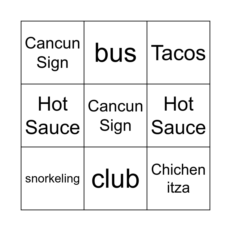 ⚠ This card has duplicate items: Chichen itza (2), Tacos (2), Cancun Sign (2), Michelada (2), Hot Sauce (2), snorkeling (2), bus (2), club (2)