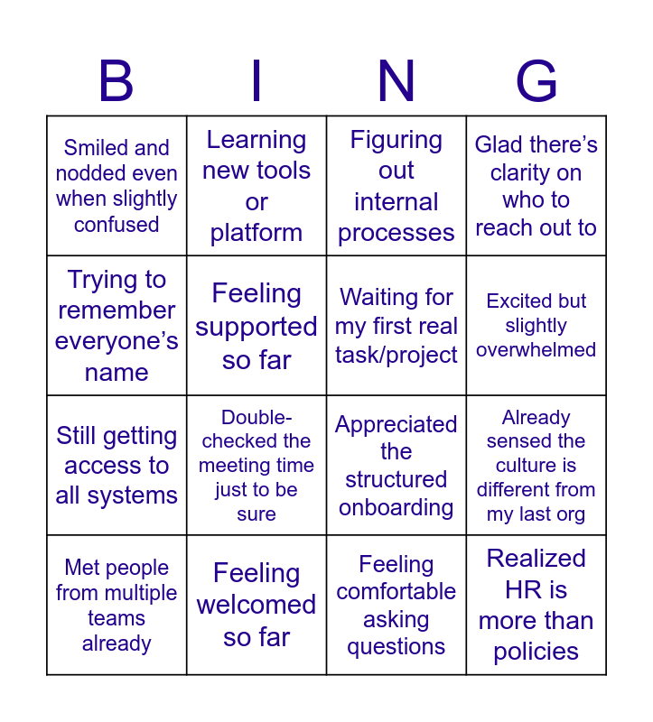 This bingo card has 17 words: Feeling comfortable asking questions, Met people from multiple teams already, Figuring out internal processes, Smiled and nodded even when slightly confused, Double-checked the meeting time just to be sure, Glad there’s clarity on who to reach out to, Already sensed the culture is different from my last org, Waiting for my first real task/project, Excited but slightly overwhelmed, Feeling supported so far, Feeling welcomed so far, Appreciated the structured onboarding, Trying to remember everyone’s name, Learning new tools or platform, Still getting access to all systems, Noticed something positive about the workplace and Realized HR is more than policies.