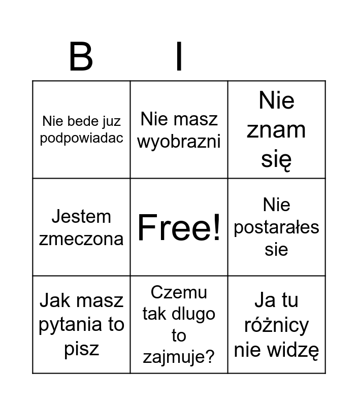 This bingo card has a free space and 8 words: Nie postarałes sie, Nie znam się, Nie masz wyobrazni, Jak masz pytania to pisz, Nie bede juz podpowiadac, Ja tu różnicy nie widzę, Jestem zmeczona and Czemu tak dlugo to zajmuje?.