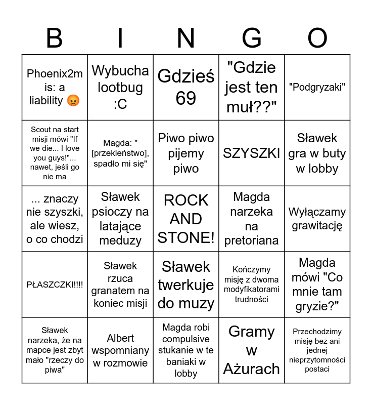 This bingo card has a free space and 24 words: Sławek rzuca granatem na koniec misji, Albert wspomniany w rozmowie, Piwo piwo pijemy piwo, Sławek narzeka, że na mapce jest zbyt mało "rzeczy do piwa", "Podgryzaki", Phoenix2m is: a liability 😡, Scout na start misji mówi "If we die... I love you guys!"... nawet, jeśli go nie ma, Wybucha lootbug :C, Magda narzeka na pretoriana, Sławek twerkuje do muzy, SZYSZKI, ... znaczy nie szyszki, ale wiesz, o co chodzi, Kończymy misję z dwoma modyfikatorami trudności, Magda mówi "Co mnie tam gryzie?", Magda: "[przekleństwo], spadło mi się", Gramy w Ażurach, Wyłączamy grawitację, Gdzieś 69, Sławek gra w buty w lobby, Sławek psioczy na latające meduzy, Przechodzimy misję bez ani jednej nieprzytomności postaci, PŁASZCZKI!!!!, "Gdzie jest ten muł??" and Magda robi compulsive stukanie w te baniaki w lobby.